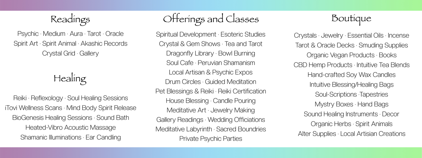 We offer traditional services in past life study (and regressions), spirit guides, shamanic healing, BioGenesis, sound therapy, reiki, and reflexology as well as a variety of classes on meditation, chakras, auras, essential oils, intuition, and mediumship that are designed to return you to balance and joy and move you forward on a journey to discover your true self. In essence, we guide you on how to be a free and sovereign being and nurture the highest version of your soul possible.